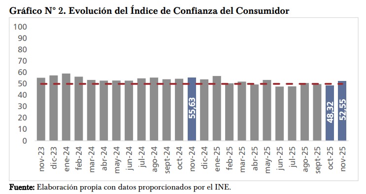 Este resultado representa una mejora frente a octubre, cuando el índice se ubicó en 48,32 puntos, lo que indica un mayor optimismo de los hogares en el corto plazo. Sin embargo, el nivel actual sigue siendo inferior al de noviembre de 2024, cuando el ICC había llegado a 55,63 puntos, mostrando que la percepción general aún no logra consolidarse.