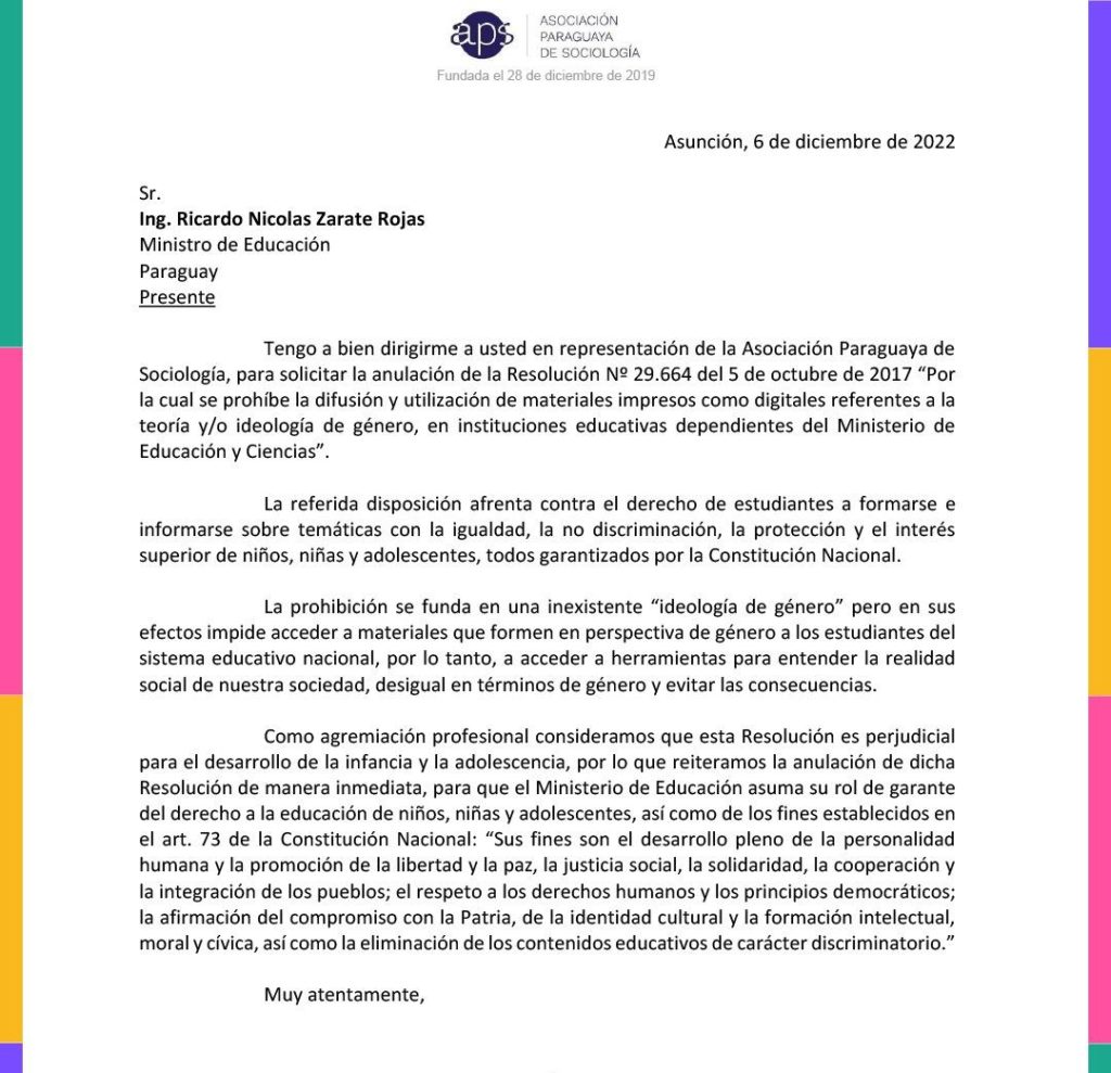 Siguen habiendo organizaciones que hacen caso omiso a lo establecido por la resolución emitida por el MEC, insistiendo en la imposición de ideología de género en el sector educativo, entre ellas: FEIPAR, quienes han solicitado la anulación de la resolución N° 29664 «POR LA CUAL SE PROHÍBE LA DIFUSIÓN Y LA UTILIZACIÓN DE MATERIALES IMPRESOS COMO DIGITALES, REFERENTES A LA TEORÍA Y/O IDEOLOGÍA DE GÉNERO EN INSTITUCIONES EDUCATIVAS». Los mismos han considerado que dicha resolución es perjudicial para el desarrollo de la infancia y adolescencia, e insta a la cartera educativa a asumir su rol como garante del derecho a la educación, justificando esta afirmación en base al articulo 73 de la Constitución Nacional «Sus fines son el desarrollo pleno de la personalidad humana y la promoción de la libertad y la paz, la justicia social, la solidaridad, la cooperación y la integración de los pueblos; el respeto a los derechos humanos y los principios democráticos; la afirmación del compromiso con la Patria, de la identidad cultural y la formación intelectual, moral y cívica, así como la eliminación de los contenidos educativos de carácter discriminatorio»