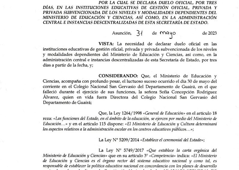 El MEC acompaña el luctuoso suceso ocurrido el 30 de mayo del corriente año en el Colegio Nacional San Gervasio del departamento de Guairá, anunciando mediante un comunicado, la disposición de mantener el pabellón de la República a media asta en todas las instituciones educativas.