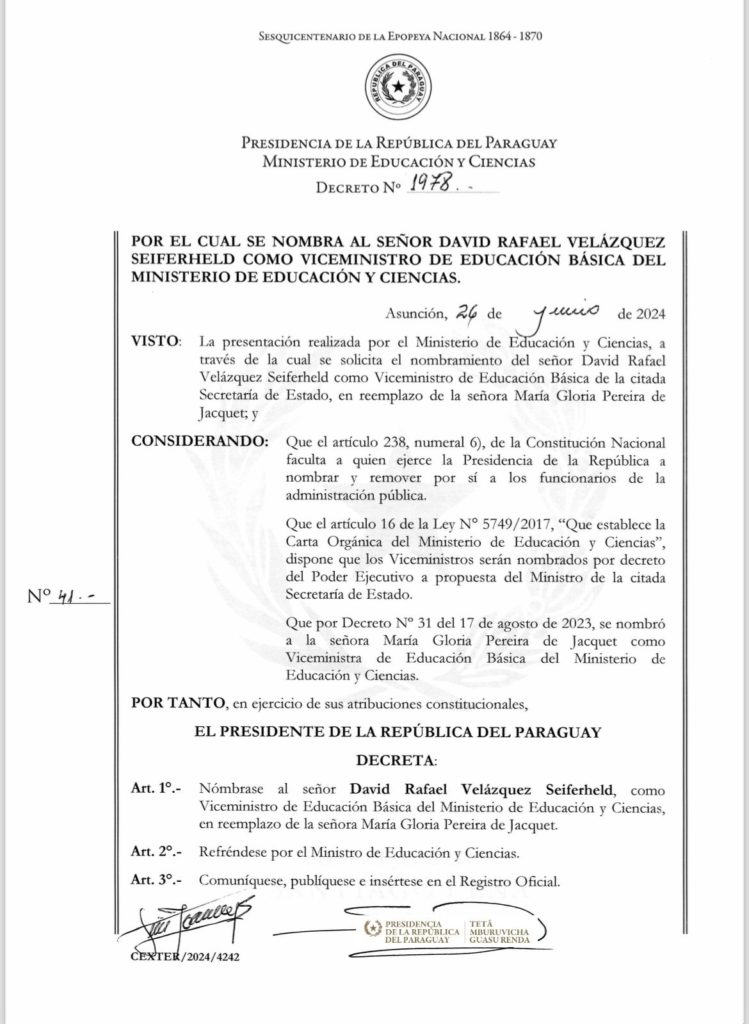 El Poder Ejecutivo ha designado a David Rafael Velázquez Seiferheld como el nuevo viceministro de Educación Básica del Ministerio de Educación y Ciencias (MEC). El presidente de la República, Santiago Peña, firmó este miércoles el Decreto Nº 1978, oficializando el nombramiento de Velázquez Seiferheld en reemplazo de la señora María Gloria Pereira de Jacquet.