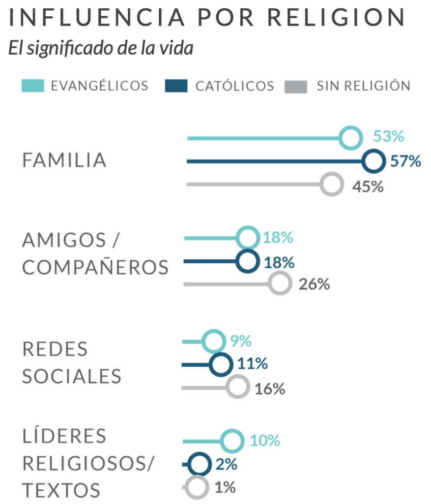 Este estudio dio como resultado que las influencias de un adolescente varían según sus creencias religiosas. Los adolescentes evangélicos acuden a los líderes religiosos en busca de orientación mucho más que los católicos, pero en general solo 1 de cada 10 dice que su pastor o la Biblia es su principal fuente de información.