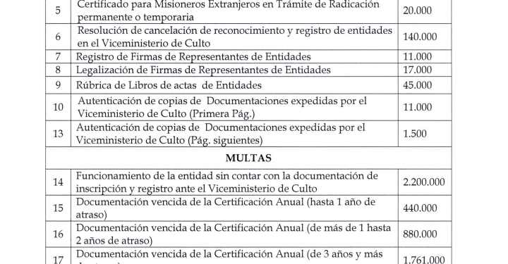 A continuación detalles sobre el monto de los aranceles y multas en vigencia: