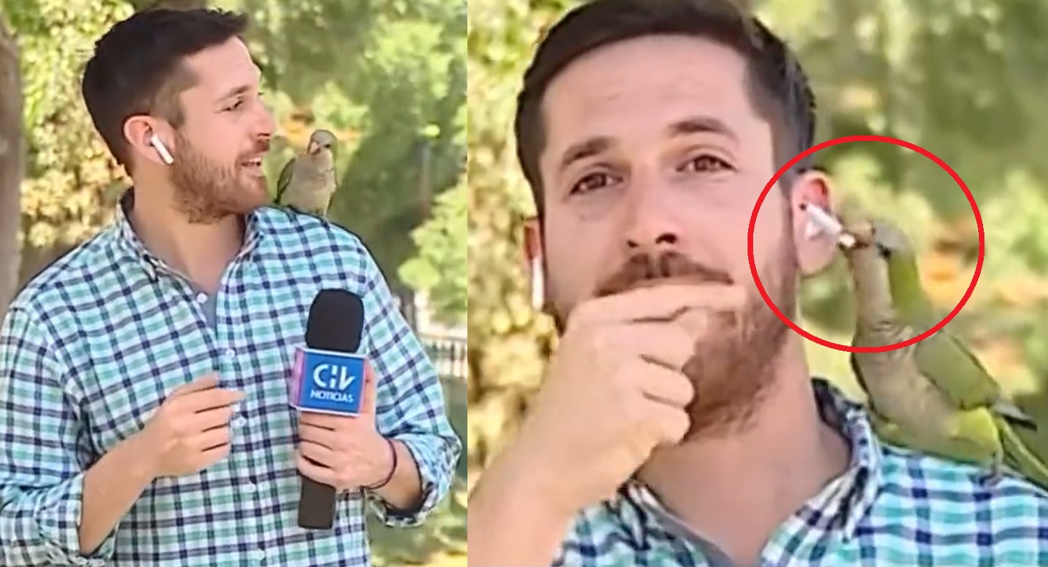 El momento más viral de la semana ocurrió con un reportero chileno que sufrió un robo bastante llamativo. Nicolás Krumm cumplía en informar sobre un asalto ocurrido en una vivienda, en ese momento una pequeña cotorra se posó sobre un hombro izquierdo, el joven en un primer momento no se da cuenta de lo que ocurría, hasta que ve al ave.