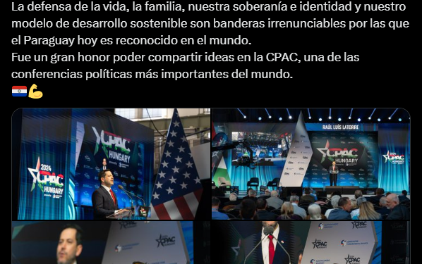 En un destacado discurso por parte del presidente de la Cámara de Diputados, Raúl Latorre, en la Conferencia de Acción Política Conservadora (CPAC), el representante de Paraguay reafirmó el compromiso inquebrantable del país con la defensa de la vida, la familia, la soberanía y la identidad nacional, así como con su modelo de desarrollo sostenible.