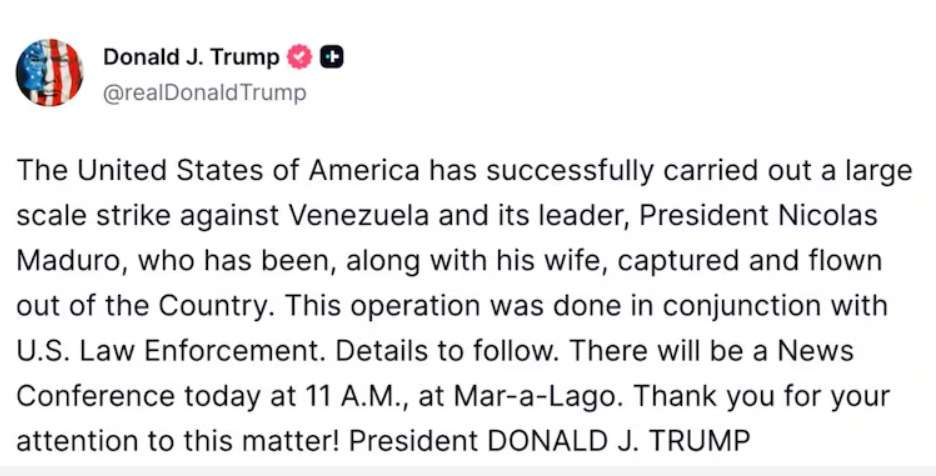 El propio Trump anunció, en su cuenta de Truth Social, la ofensiva a través de Truth Social, donde sostuvo que la acción fue ejecutada por fuerzas estadounidenses y adelantó una conferencia de prensa desde Mar-a-Lago. Hasta el momento, no existe confirmación independiente que respalde la supuesta detención del mandatario venezolano.