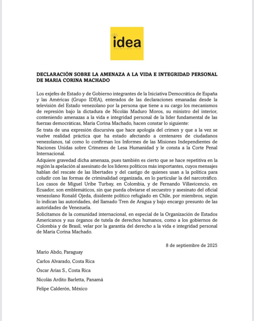 Finalmente, el Grupo IDEA instó a la Organización de Estados Americanos (OEA), a sus órganos de derechos humanos y a los gobiernos de Colombia y Brasil a adoptar medidas urgentes para salvaguardar la vida e integridad personal de María Corina Machado, considerada la figura central de la resistencia democrática venezolana.