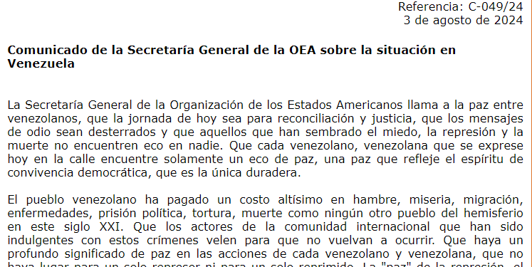 «Que cada venezolano y venezolana que se exprese hoy en la calle encuentre solamente un eco de paz, una paz que refleje el espíritu de convivencia democrática, que es la única duradera», subraya la Secretaría General. El llamado es claro: no debe haber lugar para la represión ni para el temor, y la paz verdadera debe basarse en el respeto mutuo y la democracia.