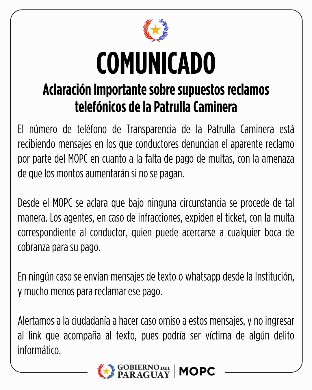 La Dirección Nacional de la Patrulla Caminera, dependiente del Ministerio de Obras Públicas y Comunicaciones (MOPC), emitió una alerta a la ciudadanía ante el surgimiento de un esquema de estafa digital que utiliza falsos reclamos de multas de tránsito para engañar a conductores y potencialmente comprometer sus datos personales y bancarios.