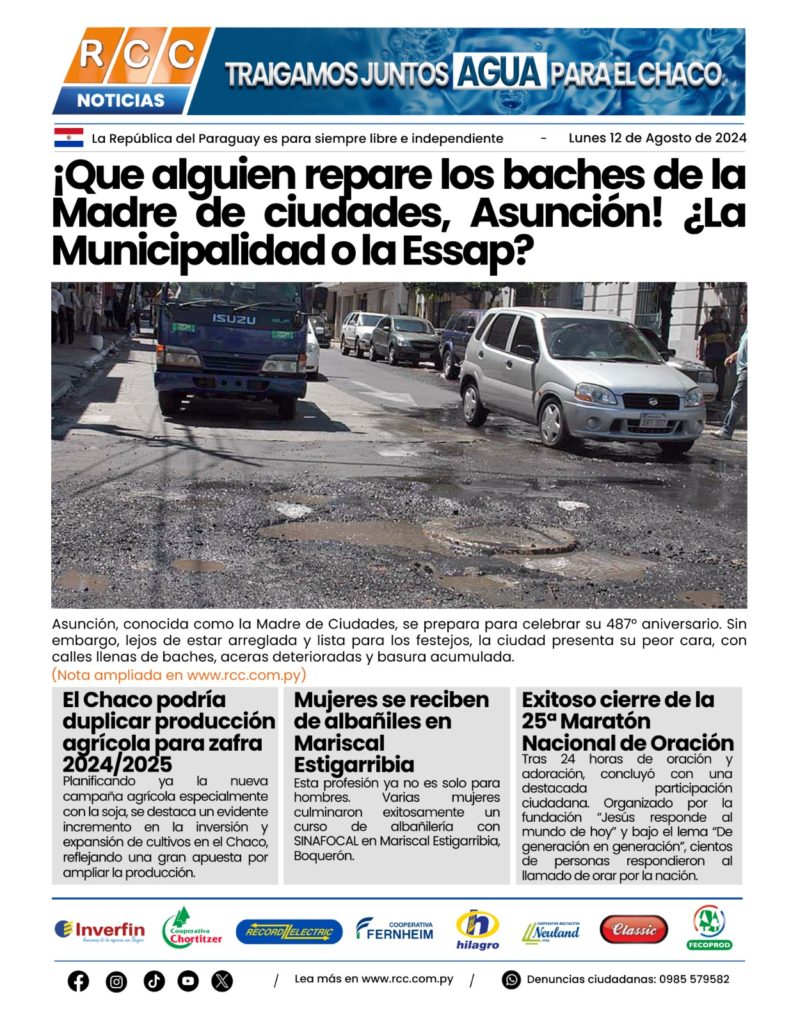 Recientemente, el equipo del Holding de Medios RCC salió a las calles para conversar con los ciudadanos sobre sus percepciones del estado de la infraestructura urbana en Asunción, especialmente en vísperas de su importante aniversario. Los comentarios recopilados revelaron un descontento generalizado debido al mal estado de las avenidas, llenas de baches, y las aceras deterioradas que dificultan el tránsito tanto de vehículos como de peatones.