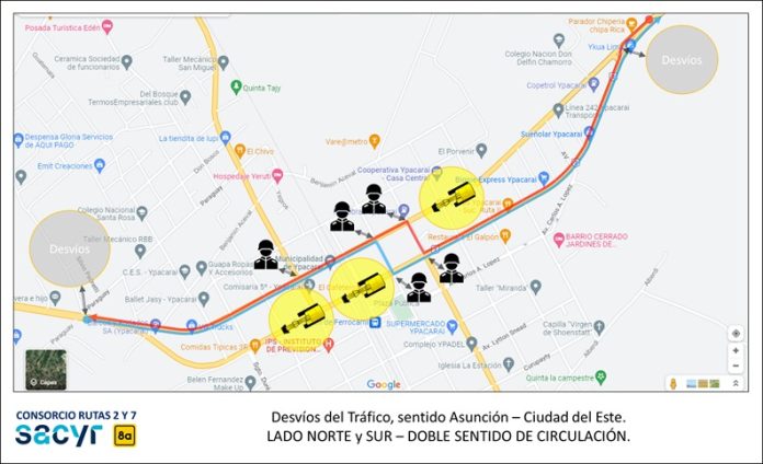 El tránsito del sentido “Asunción – Ciudad del Este”, será desviado por las siguientes tramos: