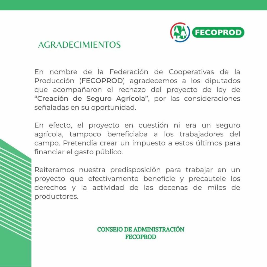 Desde la Federación de Cooperativas de Producción (FECOPROD) emitieron un duro comunicado en donde solicitan al pleno de la Cámara de Diputados que se ratifiquen en el rechazo del proyecto de ley que crea el «Seguro Agrícola para la Agricultura Familiar Campesina», ya que consideran que a pesar del título del proyecto no se trata propiamente de un seguro agrícola y tampoco protege a los agricultores.