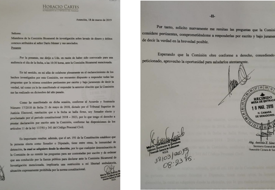 Cartes fue convocado nuevamente por esta Comisión la semana pasada para presentarse a prestar declaración hoy, a lo que el exmandatario respondió con una misiva dirigida a los miembros del Congreso que investigan el caso Messer.