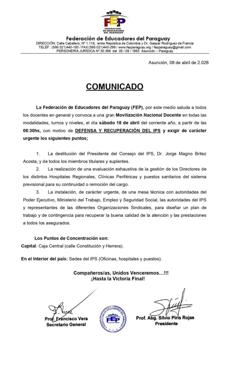 El gremio docente se prepara para una nueva jornada de movilización este próximo fin de semana. La Federación de Educadores del Paraguay (FEP) confirmó que la marcha se realizará el sábado 18 de abril, a partir de las 08:30 horas, como parte de una escalada de reclamos en torno a la situación del Instituto de Previsión Social (IPS)
