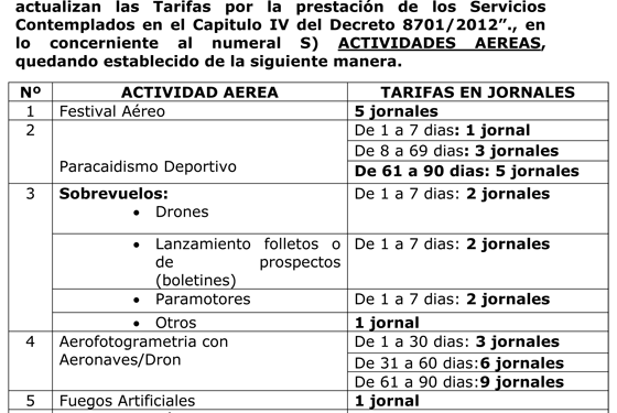 Los costos para la habilitación de otras actividades como, los festivales aéreos será de 5 jornales mínimos, es decir, Gs. 515.000. Paracaidismo deportivo se abonará según la cantidad de días requeridos: de 1 a 7 días, 1 jornal (Gs. 103.091); de 8 a 69 días, 3 jornales (Gs. 309.273) y de 69 a 90 días, 5 jornales (Gs. 515.000).