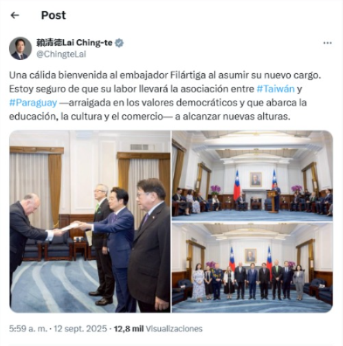 El nuevo embajador paraguayo ante la República de China (Taiwán), Darío Filártiga, entregó oficialmente sus cartas credenciales al presidente taiwanés, Lai Ching-te, durante una ceremonia realizada en el Palacio Presidencial. El mandatario taiwanés compartió un mensaje en su cuenta de X: “Una cálida bienvenida al embajador Filártiga al asumir su nuevo cargo. Estoy seguro de que su labor llevará la asociación entre #Taiwán y #Paraguay —arraigada en los valores democráticos y que abarca la educación, la cultura y el comercio— a alcanzar nuevas alturas”.