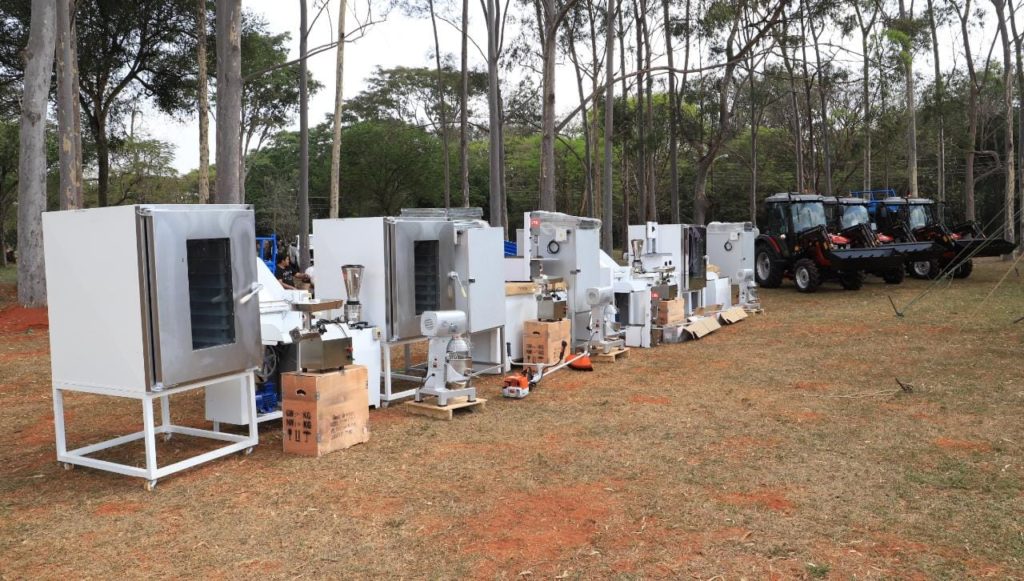 Los implementos entregados incluyen tractores agrícolas con palas cargadores de 55 HP, cortadoras rotativas, acoplados para tractor, sembradoras/abonadoras, desmalezadoras, molinos de alimentos eléctricos, licuadoras de 4 litros, sierras carniceras eléctricas, congeladores horizontales, batidoras industriales grandes, hornos industriales para panadería con 10 bandejas, refinadoras de masa, mezcladoras de masa y fermentadoras industriales.