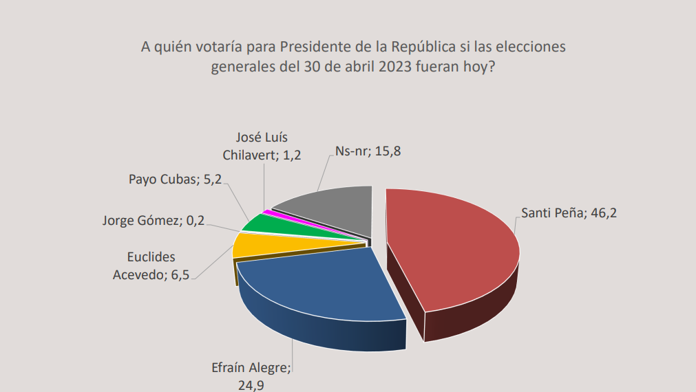 Los resultados del sondeo indican que el presidenciable de Honor Colorado cuenta con un 46,2%, seguido del representante de Concertación con un 24,9 % de la intención de votos, seguidos del ex canciller Euclides Acevedo con el 6,5%, Paraguayo Cubas con 5,2%, José Luís Chilavert con 1,2%, Jorge Gómez con 0,2, y personas que no saben o no responden pertenecen a un 15,%.