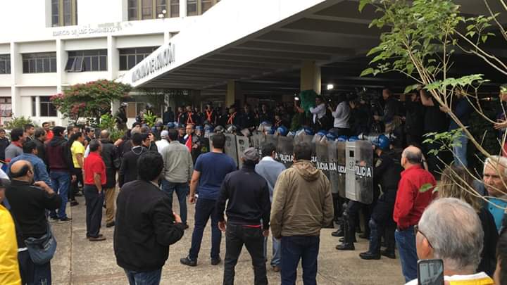 Asunción, RCC.- Los propios taxistas intentaron luego tomar por la fuerza la Municipalidad de Asunción tras ser dispersados por las fuerzas del orden, finalmente los antidisturbios pudieron contener a la masa de profesionales del volante y resguardar el edificio municipal.