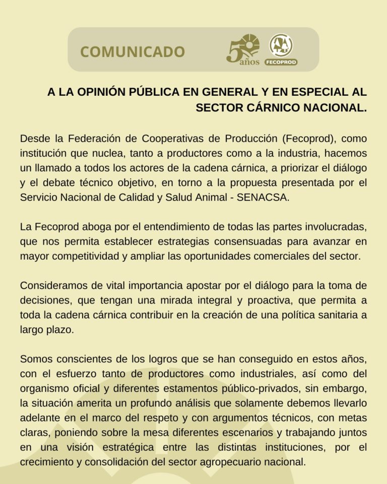 En este contexto, la Federación de Cooperativas de Producción (Fecoprod), en su rol representativo de productores, emitió un comunicado dirigido a la opinión pública y, en particular, al sector cárnico nacional, en el que exhorta a todos los actores involucrados a mantener una postura de apertura, diálogo y análisis técnico, frente a la propuesta presentada por el Servicio Nacional de Calidad y Salud Animal (SENACSA).