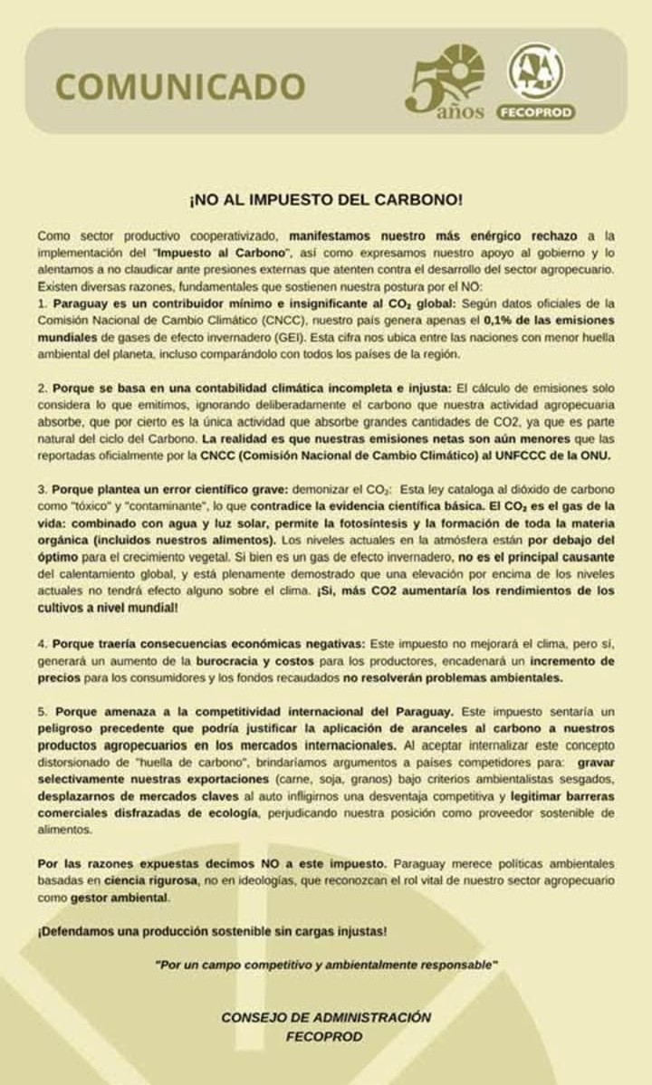 La Federación de Cooperativas de Producción (FECOPROD) se pronunció en contra del proyecto de ley que propone un Impuesto al Carbono en Paraguay. El gremio advierte que esta medida podría afectar gravemente la competitividad del sector agropecuario, además de estar basada en fundamentos científicos que consideran erróneos y que una ley así no se justifica en Paraguay, por la ínfima contribución de carbono al medioambiente.