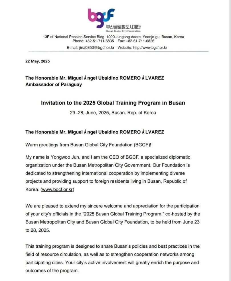 Nos complace extenderle nuestra más sincera bienvenida y agradecimiento por la participación de los funcionarios de su ciudad en el “Programa de Capacitación Global de Busan 2025”, coorganizado por la Ciudad Metropolitana de Busan y la Fundación Busan Global City, que se llevará a cabo del 23 al 28 de junio de 2025.