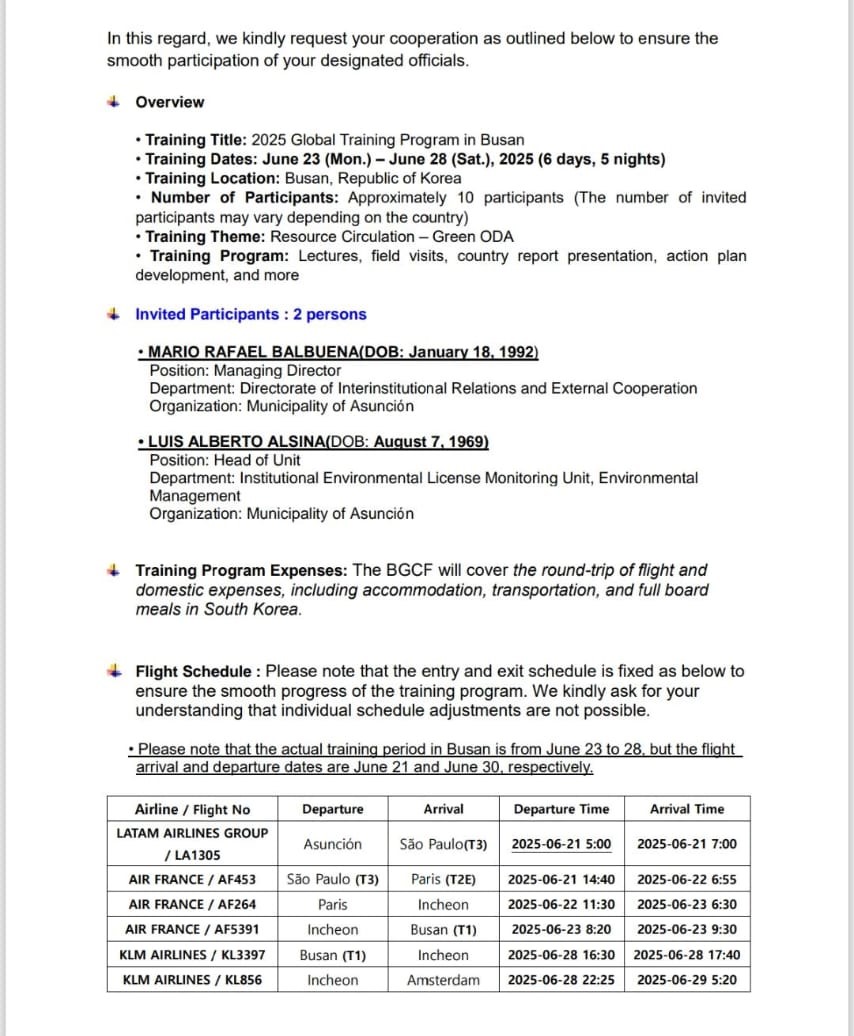 El viaje de los funcionarios municipales inició el 21 de junio y culminará el 30 del mismo mes, siguiendo una extensa ruta aérea a través de São Paulo, París, Incheon, Ámsterdam y Panamá antes de regresar a Asunción.