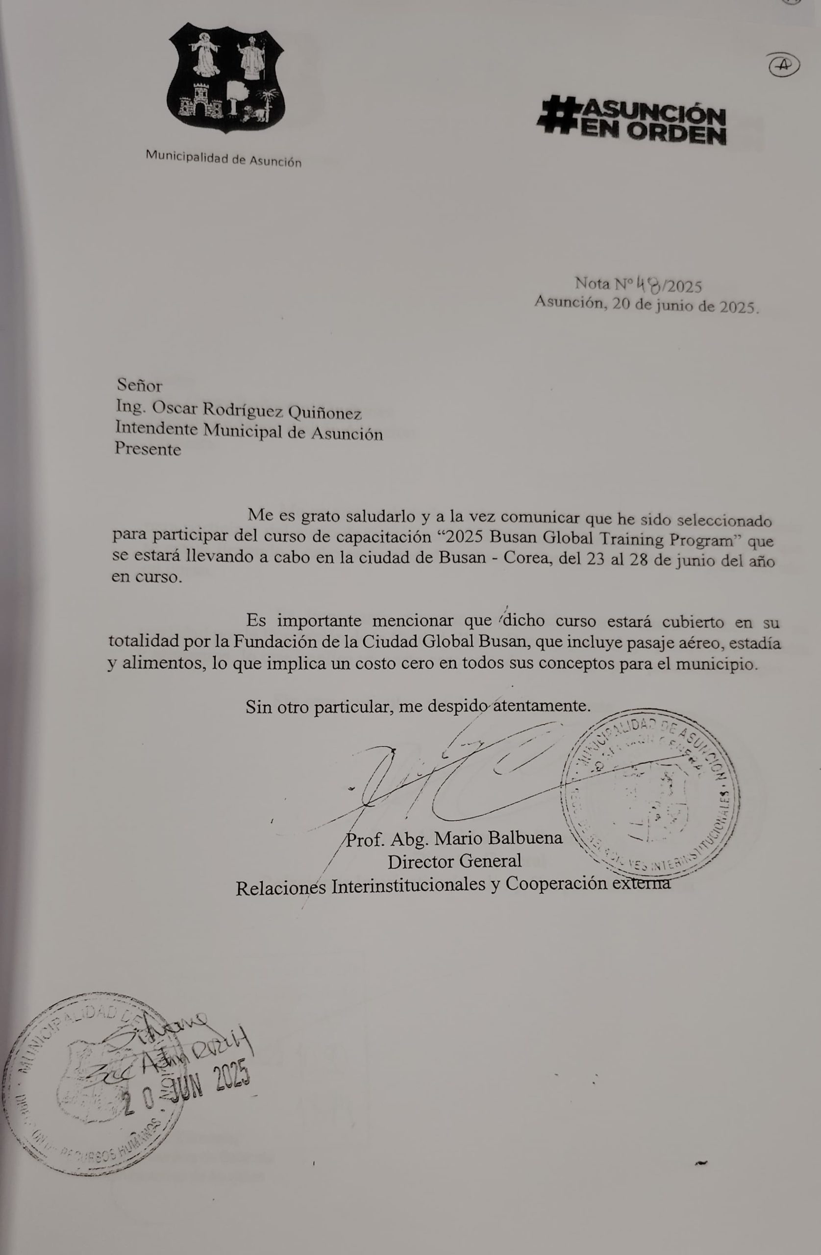 El director general de Relaciones Interinstitucionales y Cooperación Externa de la Municipalidad de Asunción, Mario Rafael Balbuena, aclaró que su participación en el Programa de Capacitación Global 2025 en Busan, Corea del Sur, no representó ningún costo para las arcas municipales.