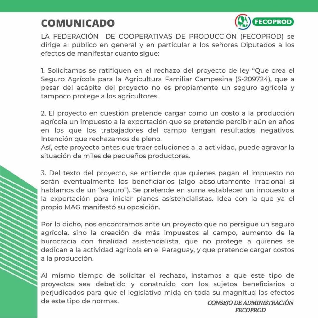 «Del texto del proyecto, se entiende que quienes pagan el impuesto no serán eventualmente los beneficiarios. Se pretende en suma establecer un impuesto a la exportación para iniciar planes asistencialistas. Idea con la que ya el propio MAG manifestó su oposición. Por lo dicho, nos encontramos ante un proyecto que no persigue un seguro agrícola, sino la creación de más impuestos al campo, aumento de la burocracia con finalidad asistencialista, que no protege a quienes se dedican a la actividad agrícola en el Paraguay, y que pretende cargar costos a la producción», indicaron.