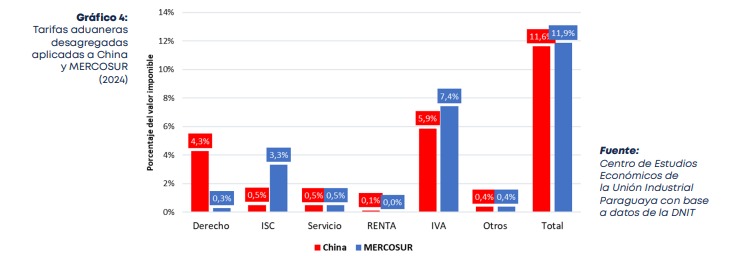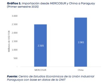 Sin embargo, el estudio advierte que en el primer semestre de este año se percibe un cambio que, si bien puede ser estacional, vale la pena mencionar. Dice que al cierre del primer semestre de este año, las importaciones desde China a Paraguay superaron a las importaciones desde el Mercosur en aproximadamente 16%.