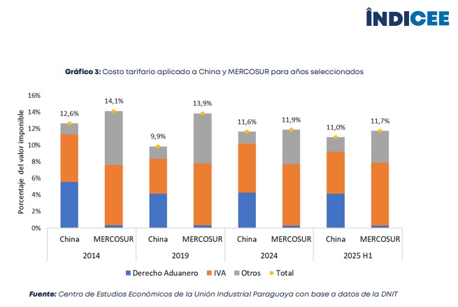 La diferencia de la recaudación total a favor del Mercosur se debe no solamente al mayor volumen de importaciones, sino a los costos más elevados respecto a China. Destaca que en el año 2024 el aporte del Mercosur a las arcas del Estado por importaciones alcanzó los USD 718 millones versus los USD 653 millones por productos importados desde China.
