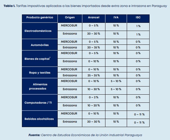 En cuanto al costo fiscal de la importación (compuesto por tasas impositivas y arancelarias) desde extrazona supera al de intrazona, dado los acuerdos comerciales existentes de por medio. La Tabla 1 resume las tasas aplicadas a cada grupo de productos según su origen. Como es de esperarse, a excepción del IVA, la diferencia entre los impuestos y aranceles fijados sobre productos con origen extrazona superan ampliamente a los de intrazona.