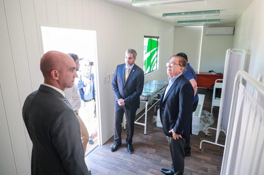 El presidente de la República, Mario Abdo Benítez, acompañado del ministro de Salud, Julio Mazzoleni, y el director de la EBY, Nicanor Duarte Frutos, inspeccionó esta mañana los containers consultorios móviles, que serán entregadas en la fecha a hospitales de Limpio, San Lorenzo y Lambaré, en el marco de la política sanitaria que busca evitar grandes aglomeraciones en los hospitales públicos.