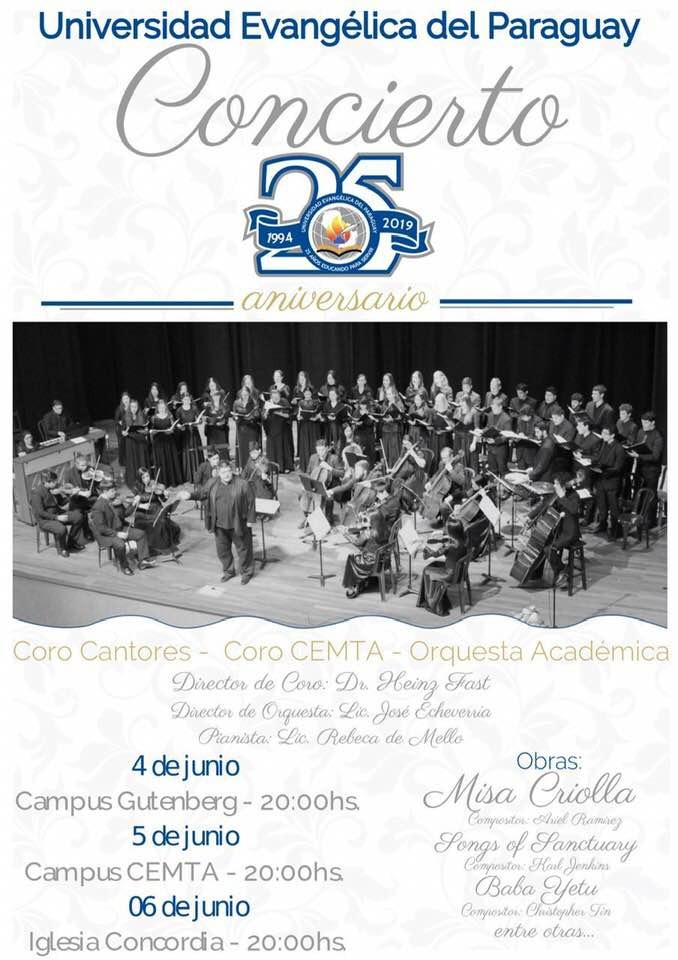 Los conciertos se desarrollarán en tres días y lugares diferentes, 4, 5 y 6 de junio. El 4 de junio será en el campus Gutenberg (en el auditorio), el 5 de junio va a ser en el campus CEMTA y el 6 de junio va a ser en la iglesia Concordia, los tres días iniciarán los conciertos a las 20:00 hs.