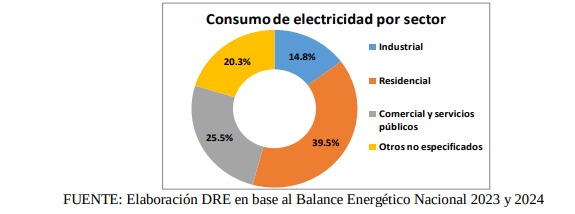 El BEN agrega que el consumo final de energía eléctrica en el año 2024 alcanzó los 19.444,2 GWh (Gigavatios), experimentando un incremento del 21,6 % en comparación con el año previo. Este aumento supera la tasa de crecimiento acumulada del 5,8 % observada durante la década anterior, comprendida entre los años 2013 y 2023, señalando una aceleración notable en la demanda eléctrica en tan solo un año. Desde el punto de vista estructural, el sector residencial continúa siendo el de mayor demanda, con el 39,5 % del total del consumo registrado.