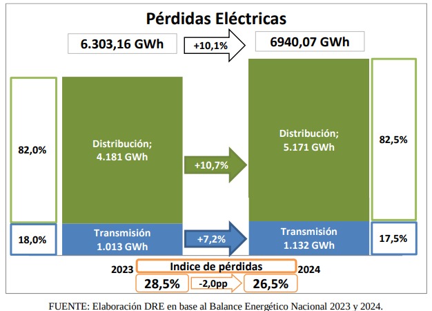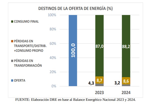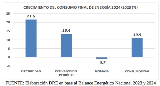 El incremento registrado en el consumo de electricidad en el año 2024 significó un aumento de 2,3 puntos porcentuales en su participación en la estructura del consumo final de energía a nivel nacional, mientras que el incremento en el consumo de derivados del petróleo representó 1 punto porcentuales más en dicha estructura.