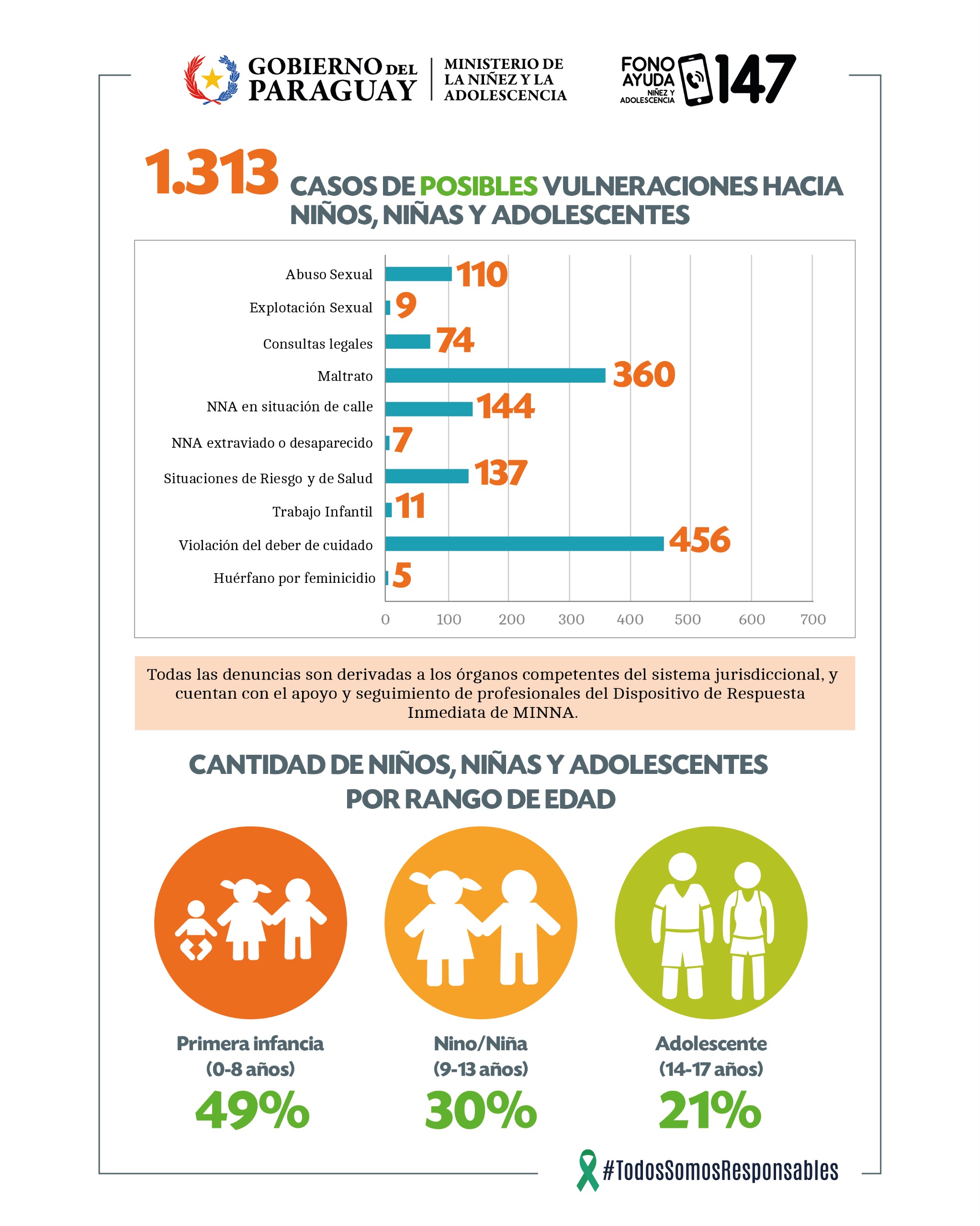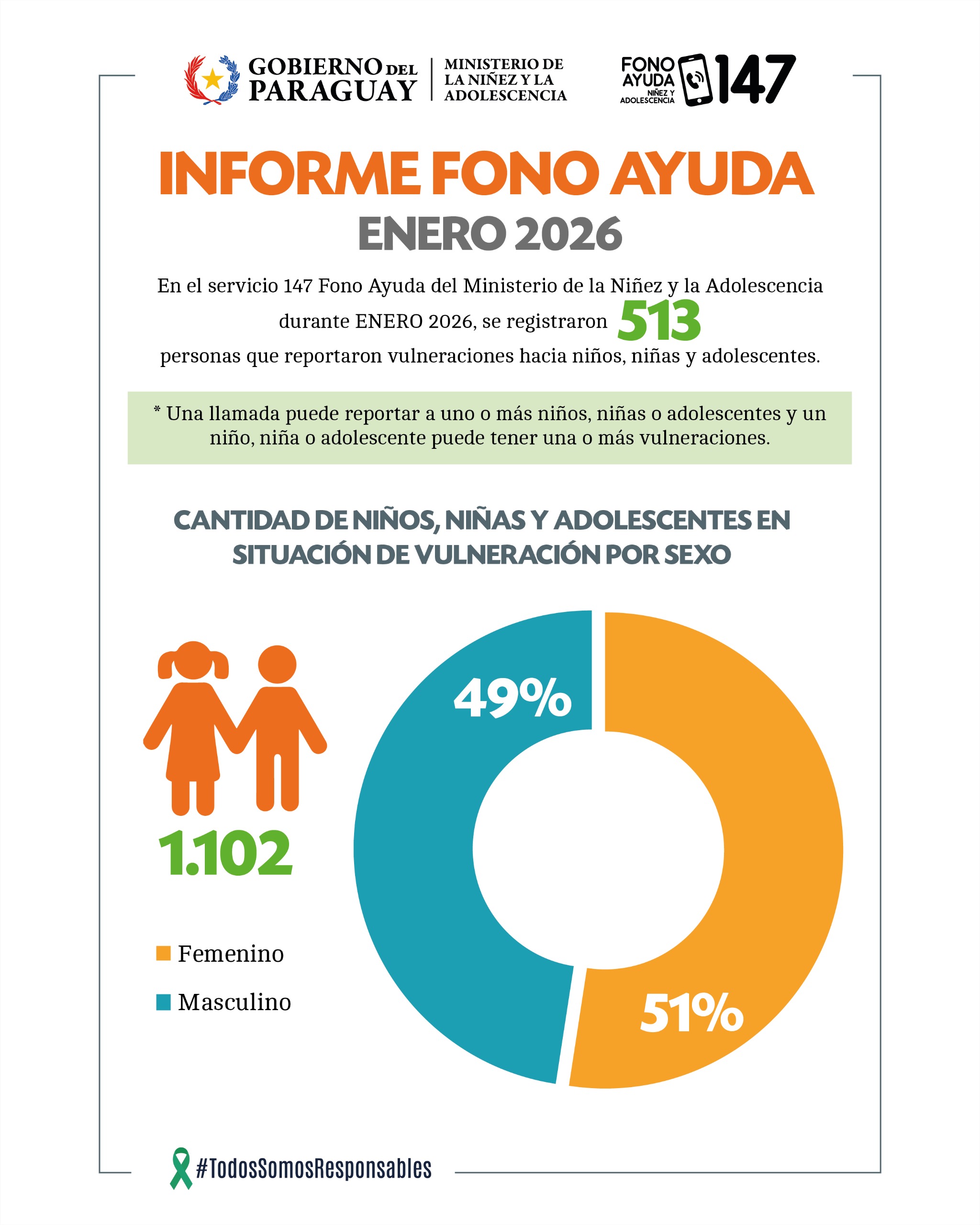 El mes de enero de 2026 se inició con un preocupante registro de 1.102 niños, niñas y adolescentes en situación de vulnerabilidad en Paraguay, según el primer informe del año de la línea gratuita 147 Fono Ayuda, dependiente del Ministerio de la Niñez y la Adolescencia (MINNA).