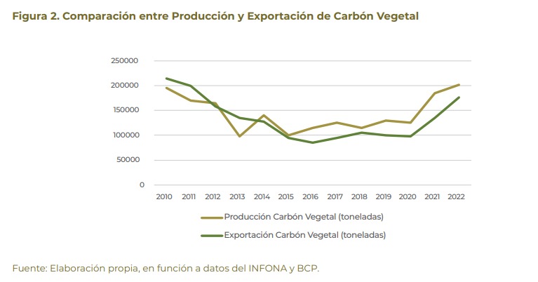 Según cifras reportadas por el BCP, a través de su Boletín de Comercio Exterior, aun cuando las exportaciones de carbón vegetal se redujeron de unas 215,8 mil toneladas anuales en el año 2010, a 86,9 mil toneladas en el 2016; sin embargo, a partir del año 2017 se verifica “un repunte importante”, llegando a 176,7 mil toneladas en el 2022, menciona igualmente el documento del VME.