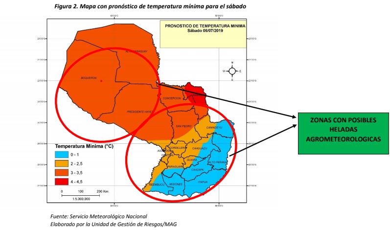 En síntesis la probabilidad de heladas para el día 6 de Julio es bastante alta, para los departamentos del Sur, Este, Centro y Sur de Central, cabe destacar que en casi toda la región Oriental llegaría con intensidad.