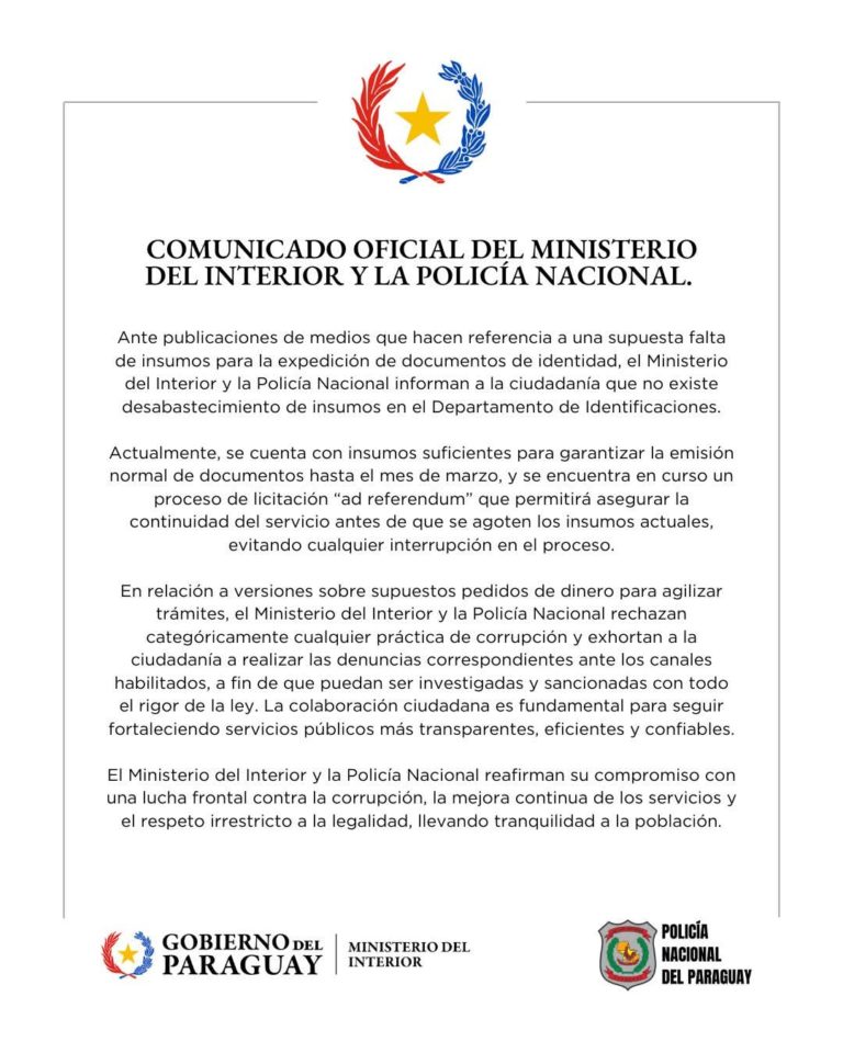 El Ministerio del Interior y la Policía Nacional emitieron un comunicado oficial en el que desmienten categóricamente la existencia de un desabastecimiento de insumos en el Departamento de Identificaciones, tras publicaciones que generaron preocupación en la ciudadanía.