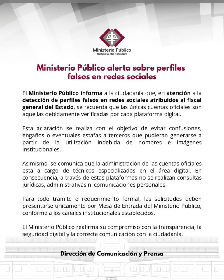 El Ministerio Público emitió un comunicado alertando a la ciudadanía sobre la existencia de perfiles falsos en redes sociales que utilizan indebidamente la identidad del fiscal general del Estado, Emiliano Rolón. La institución subraya que las únicas cuentas oficiales son aquellas debidamente verificadas por cada plataforma digital.