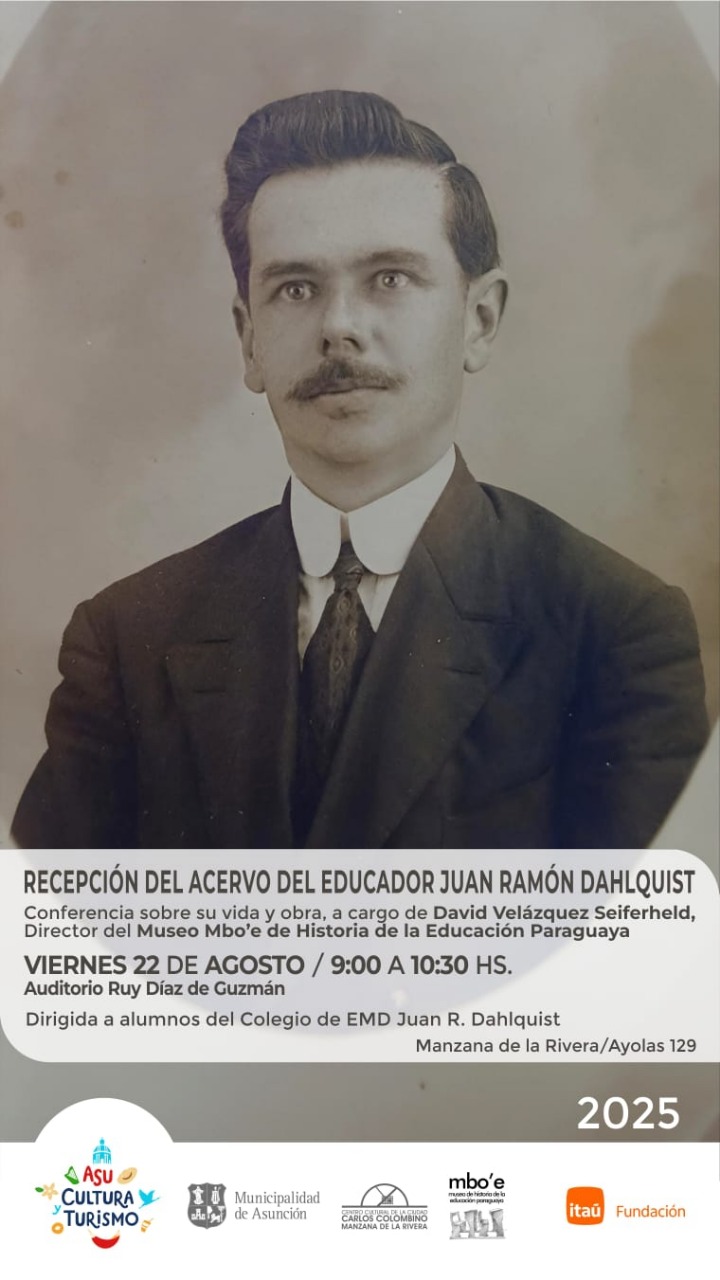 El Museo de Historia de la Educación Mbo’e, institución dedicada a la preservación y difusión del patrimonio pedagógico paraguayo, presentará este viernes 22 de agosto, a las 09:00, en el Centro Cultural de la Ciudad “Carlos Colombino” – Manzana de la Rivera, un valioso acervo documental que perteneció al maestro Juan Ramón Dahlquist.