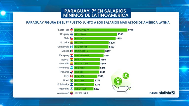 En lo más alto de la lista figura Costa Rica, con un salario mínimo mensual de 726 dólares, seguida por Uruguay (586 dólares) y Chile (565 dólares). Completan los primeros lugares Ecuador (470 dólares), Guatemala (467 dólares) y México (417 dólares), antes de llegar a Paraguay.