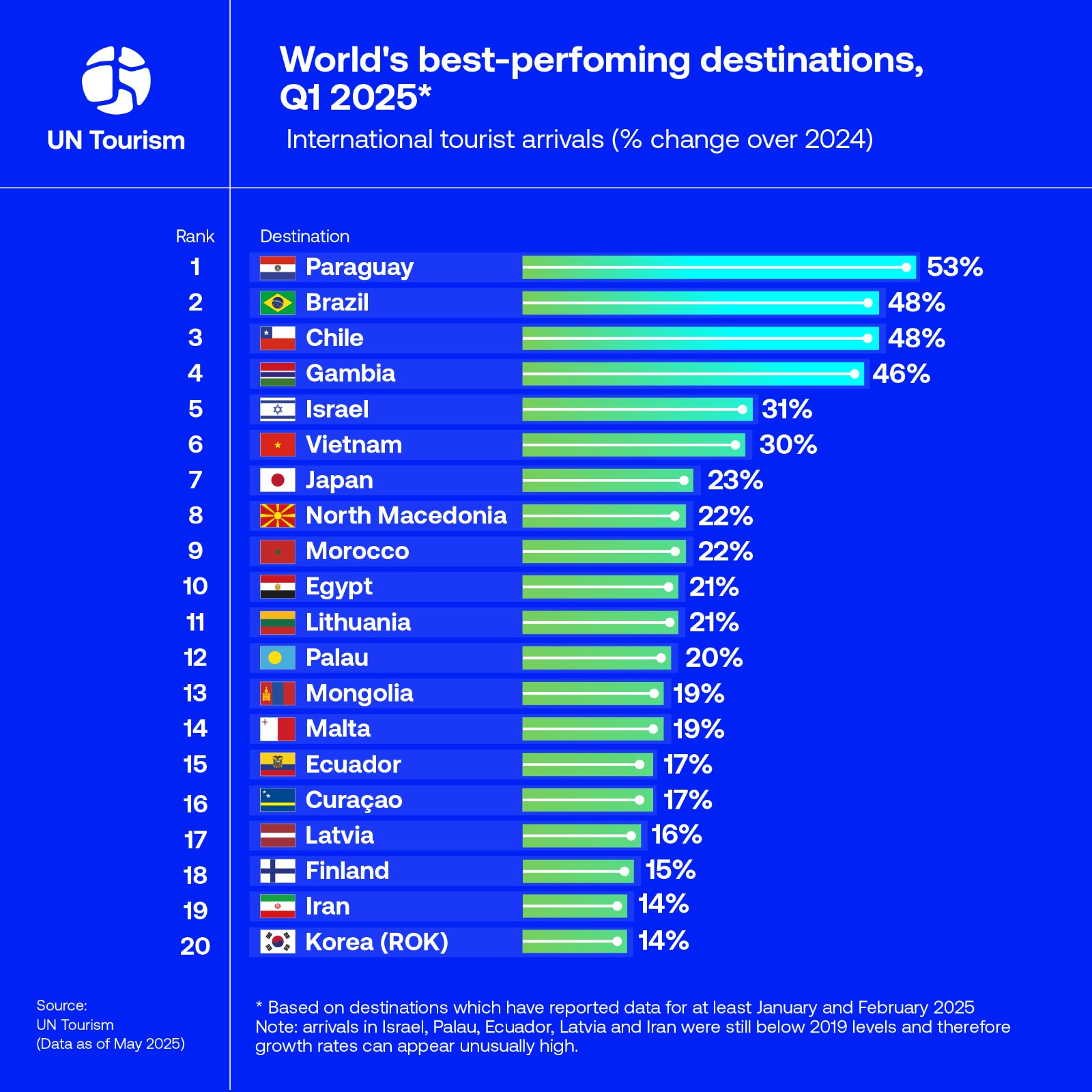 De acuerdo a la Secretaría Nacional de Turismo (SENATUR), que también se hizo eco del informe de “ONU Tourism”, este “notable desempeño” coloca a Paraguay en la cima del ranking global de recuperación y crecimiento turístico, destacando el “atractivo cada vez mayor” del país ante los ojos del mundo.