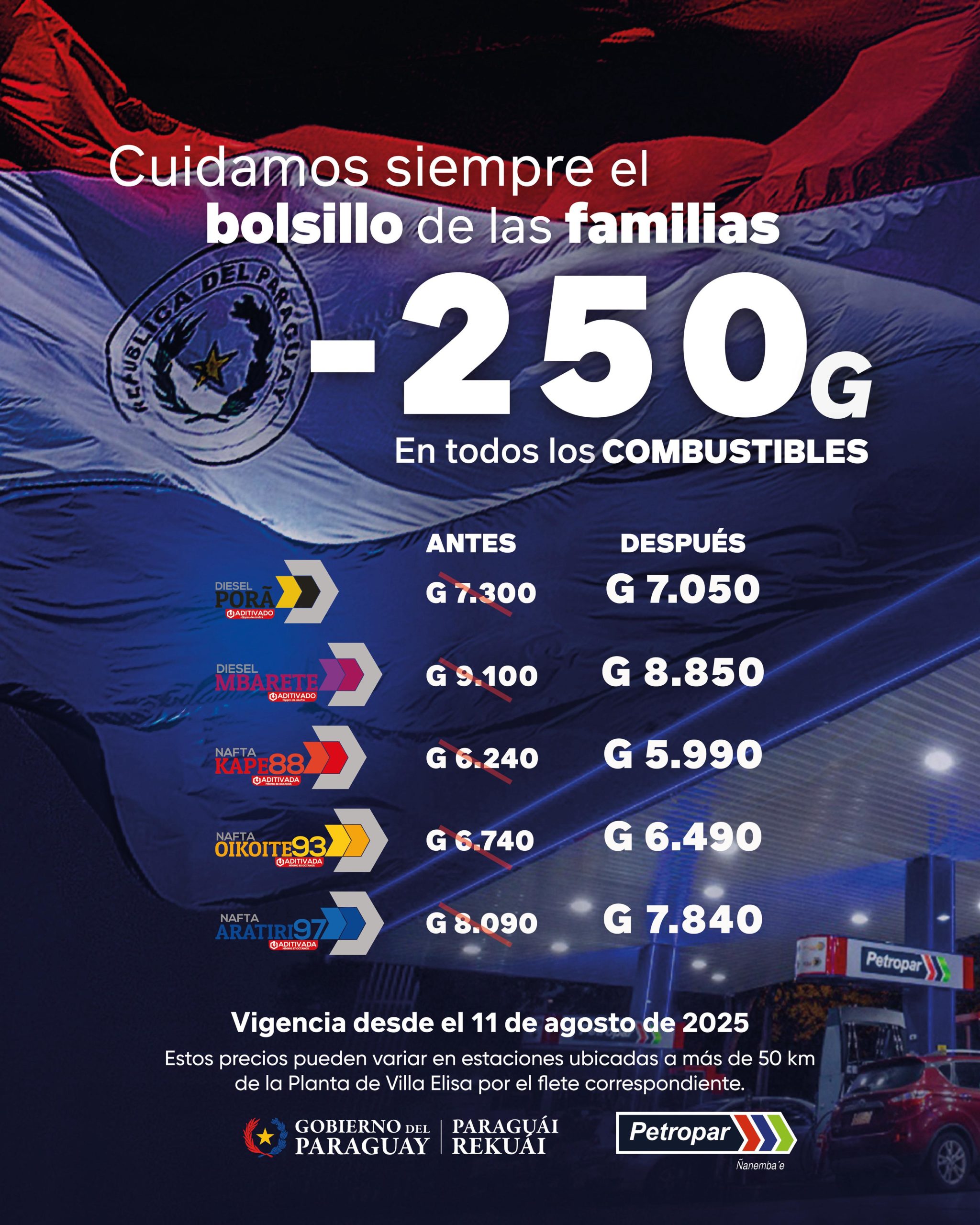 El presidente de la República, Santiago Peña, anunció una nueva reducción en el precio de los combustibles, con una rebaja de 250 guaraníes por litro que entrará en vigencia desde este lunes 11 de agosto. La medida beneficiará a todos los tipos de combustibles, consolidando así la séptima disminución en el diésel y la octava en las naftas desde el inicio de su mandato.