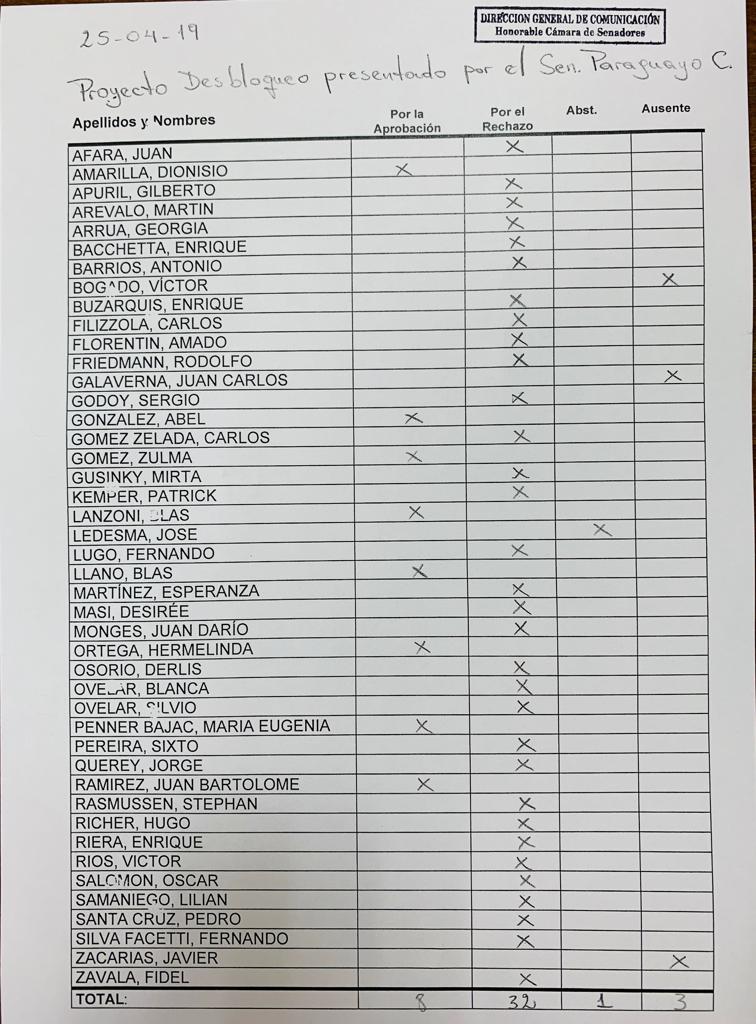Asunción, RCC.- Con solo ocho votos a favor, 32 en contra, una abstención y tres ausencias, el proyecto que modifica el artículo 258 de la Ley del Código Electoral Paraguayo y que es más conocido como desbloqueo de listas sábana fue rechazado y enviado al archivo.