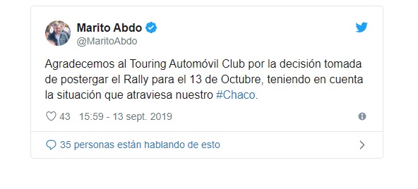 Filadelfia, RCC.- A las 16:00 horas de este viernes, el presidente Mario Abdo hizo el anuncio: «Agradecemos al Touring Automóvil Club por la decisión tomada de postergar el Rally para el 13 de Octubre, teniendo en cuenta la situación que atraviesa nuestro #Chaco.»