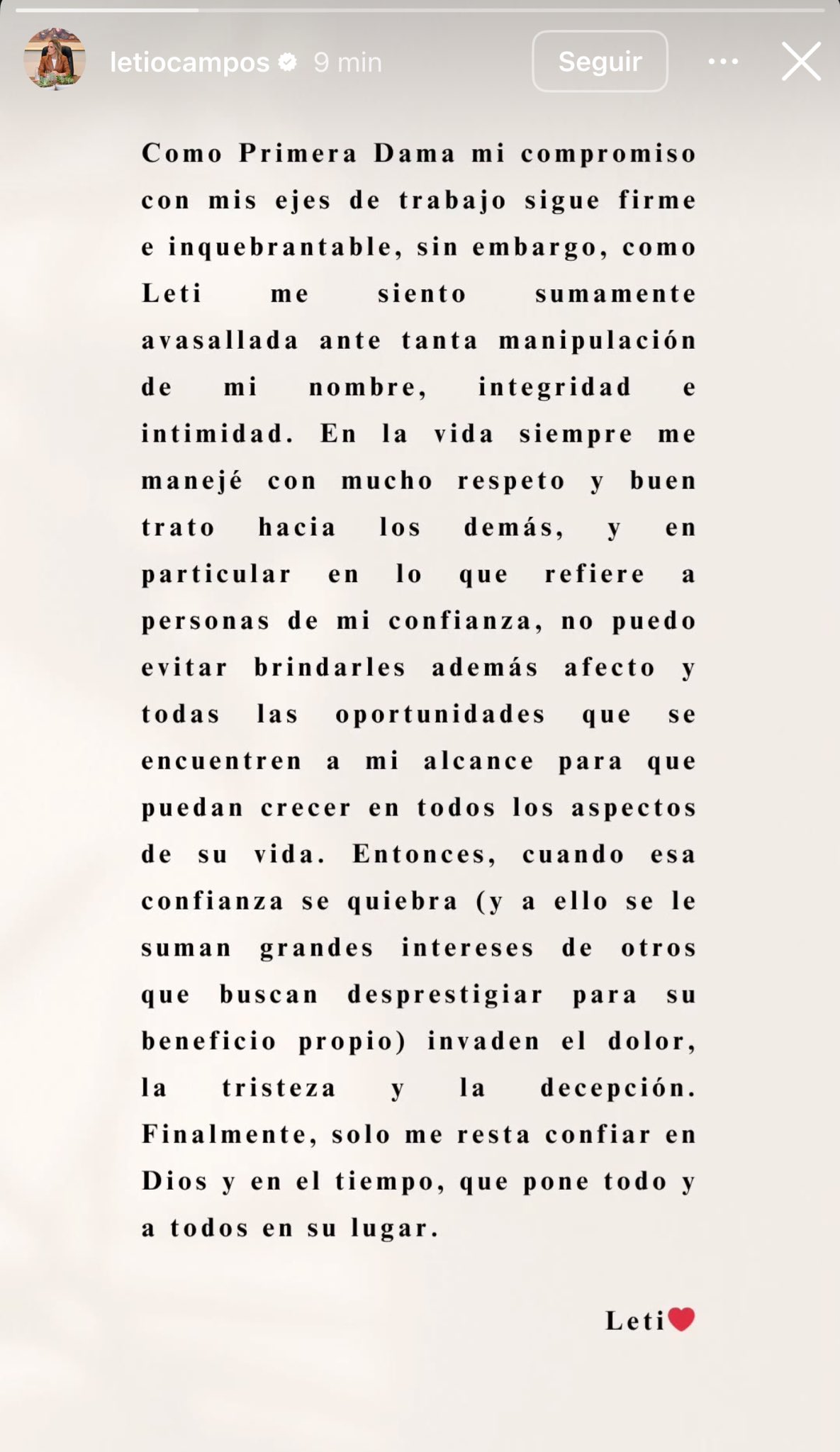 “Como Primera Dama mi compromiso con mis ejes de trabajo sigue firme e inquebrantable, sin embargo, como Leti me siento sumamente avasallada ante tanta manipulación de mi nombre, integridad e intimidad”, señaló Ocampos, quien firmó el mensaje de manera personal.