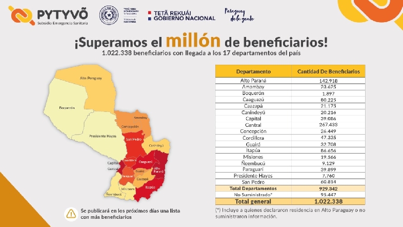 Filadelfia, RCC.- La mayor cantidad de beneficiarios registrados hasta el momento se encuentra en Central, con un total de 267.433; luego siguen Alto Paraná con 142.918; Itapúa con 86.656; Caaguazú con 80.225; San Pedro con 60.814; Cordillera con 47.335; Paraguarí con 39.899; Capital con 39.086 personas.