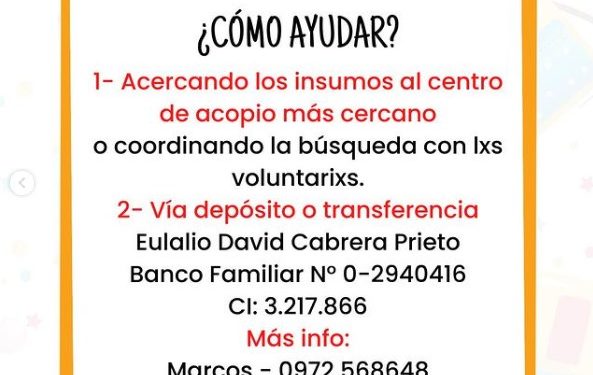 Todas las personas que deseen colaborar con esta iniciativa pueden comunicarse con la organización Brigadas Solidarias a través de los siguientes números (0981) 744 -615 o al (0971) 544 -772, y también a través de las redes sociales de dicha organización.