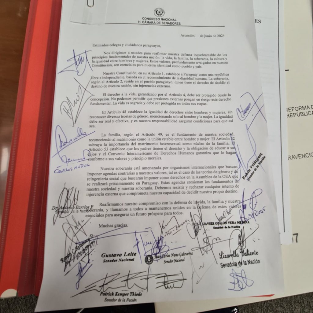 «La Constitución, en su artículo 1, establece a Paraguay como una República libre e independiente, basada en el reconocimiento de la dignidad humana. La soberanía, según el artículo 2, reside en el pueblo paraguayo, quien tiene el derecho de decidir el destino de nuestra nación sin injerencias externas», señalaron los senadores.